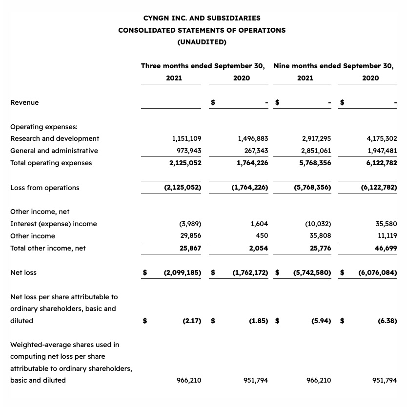 MENLO PARK, Calif. Cyngn (or the “Company”) (NASDAQ: CYN), a developer of innovative autonomous driving software solutions for industrial and commercial enterprises, today announced its unaudited financial results for the third quarter ended September 30, 2021.