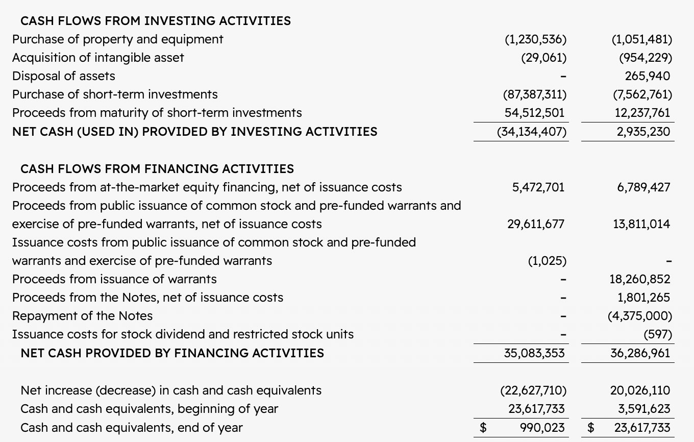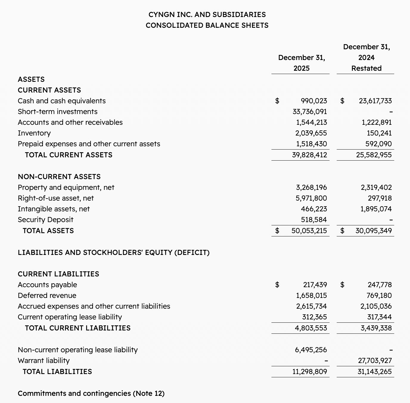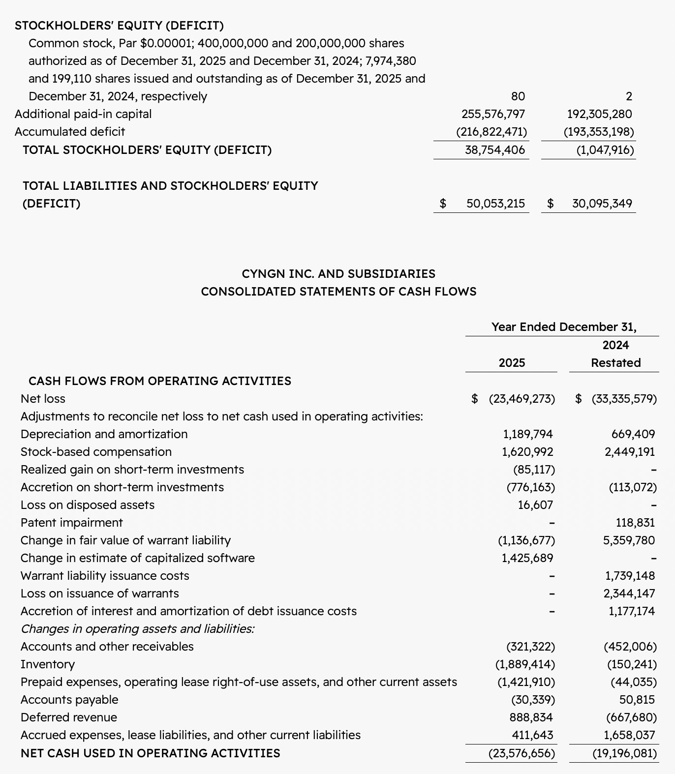 Cyngn's unrestricted cash and short-term investments as of December 31, 2025 totaled $34.7 million compared to $23.6 million as of December 31, 2024. At the end of the same period, working capital was $35 million and total stockholders' equity was $38.8 million, as compared to year-end working capital of $22.1 million and total stockholders' equity of $(1) million, respectively as of December 31, 2024. The Company had no debt as of December 31, 2025 and December 31, 2024 and to date, no member of the current management team has sold any shares of the Company's stock.