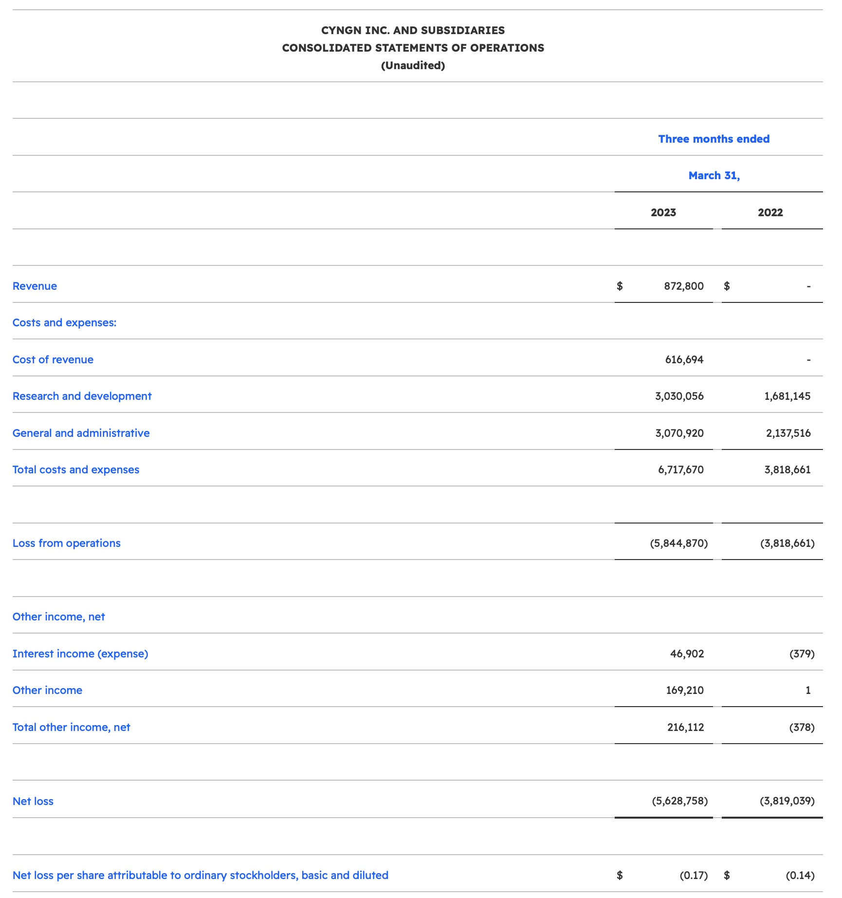 - Revenue was $0.9 million for the first quarter of 2023 compared to zero revenue in the corresponding quarter of 2022. Substantially, all of this revenue was related to two multi-phase non-recurring engineering (“NRE”) contracts related to projects that expand Cyngn’s technology to additional vehicle types - forklifts and mining vehicles.
